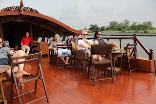 We saw an odd mix of the old and new as we motored at a leisurely pace along the river. Buddhist temples and their associated buildings certainly dominated the structures we saw along the riverbanks. On the river itself, our boat was joined by craft as small as one-person fishing skiffs to huge barges of rice, ore and other materials being hauled up and down the river by tugboats. At various points, we also saw large rafts of water hyacinth plants floating on top of the river.